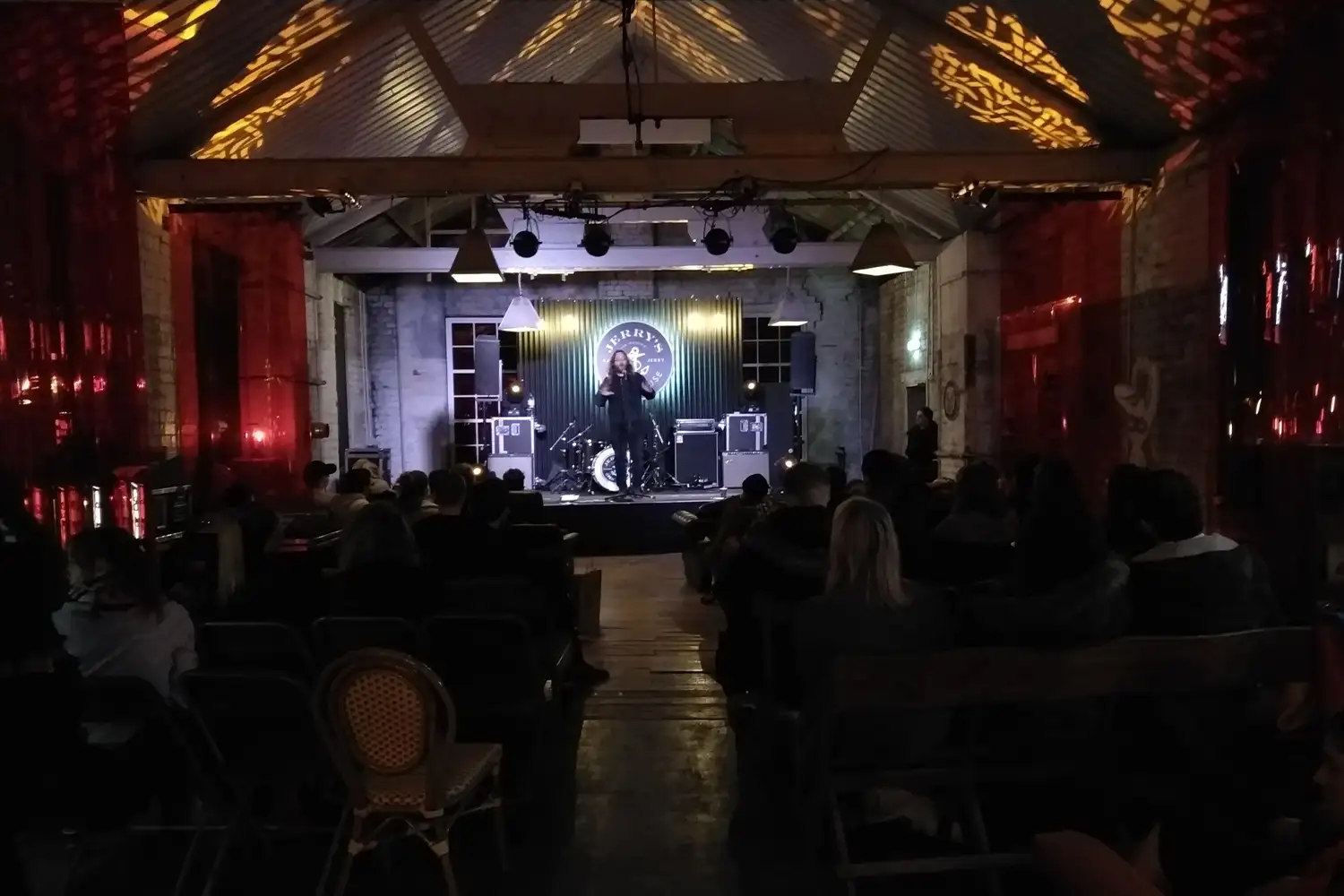 Following an afternoon orientating ourselves in the city, we made our way to the venue. The entrance was a non-descript door next to a fishmonger’s depot in an unlikely part of central Glasgow. The door led up four flights of stairs to a very trendy space at the top of the building. At one end of the room was a bar serving rum and at the other a stage with drum kit, guitar amps and microphones. In between, there was a space for screen printing T-shirts for the night, some sofas and an eclectic collection of chairs. We were in for a good night.